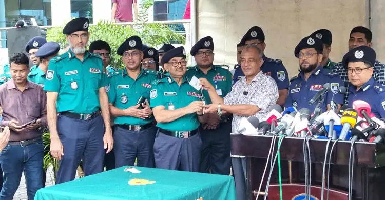স্বরাষ্ট্র উপদেষ্টা মো. জাহাঙ্গীর আলম চৌধুরীর কাছ থেকে গাড়ির চাবি বুঝে নেন ডিএমপি কমিশনার শেখ মো. সাজ্জাদ আলী।
