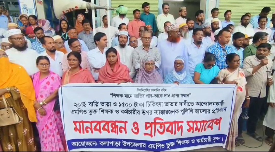 বাড়ি ভাড়া এবং শিক্ষক নির্যাতনের প্রতিবাদে কলাপাড়ায় শিক্ষকদের মানববন্ধন ও সমাবেশ